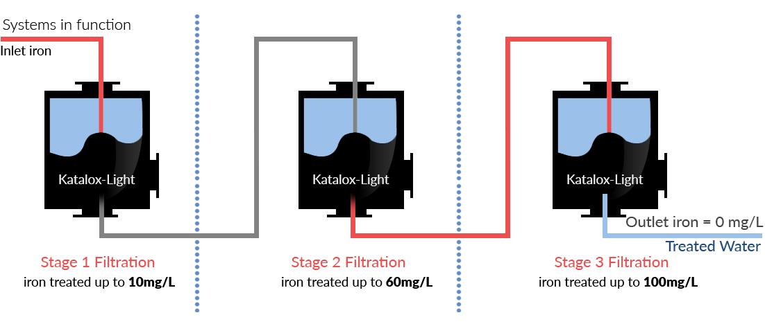 Real installations from different part of the world have been reported to remove unchallenged amounts of iron. In a few extreme cases multi-stage Katalox-Light® filtration systems have been used without the use of any chemicals to remove iron with inlet concentration of as high as 60 – 100 mg/L (ppm).